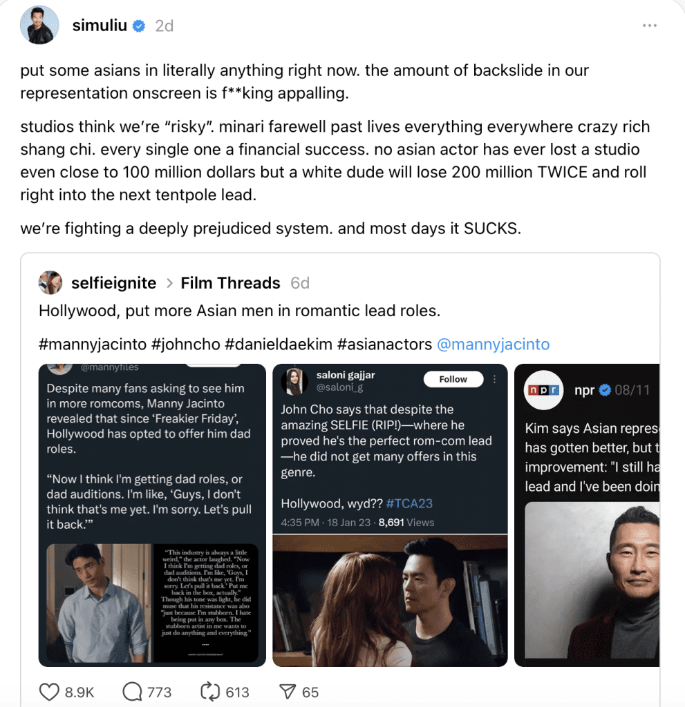 Yet somehow the industry keeps acting like those victories never happened. “No Asian actor has ever lost a studio even close to 100 million dollars,” Liu wrote, “but a white dude will lose 200 million twice and roll right into the next tentpole lead.” In his words, “we’re fighting a deeply prejudiced system.”