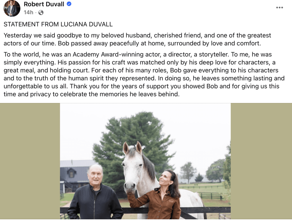 His wife, Luciana Duvall, shared the news with a mix of grief and quiet gratitude: